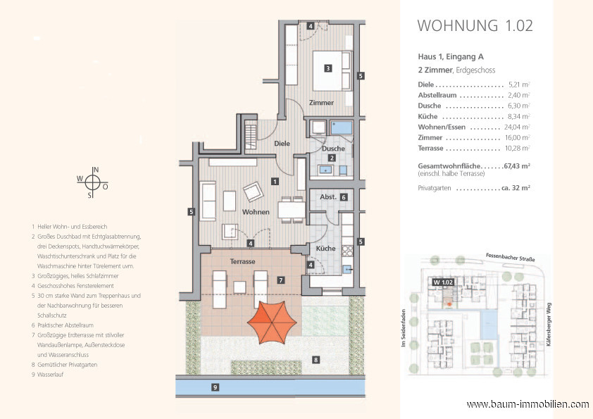 Zwischen Stadtkern und Natur entsteht hier künftig Ihr neues Zuhause. Landschaftlich reizvoll eingebettet liegt Offenburg zwischen den Höhen des Schwarzwaldes, den Rheinauen und den Elsässer Vogesen, im schönen badischen Weinbaugebiet Ortenau. Das Gebäude besticht durch klare architektonische Linienführung mit zurückhaltenden Formen und begrünten Flachdächern. Die großen Fensterflächen, die viel Licht in die zwei Zimmerwohnung bringen und eine behagliche Atmosphäre schaffen, sprechen für sich. Der Wassergarten wird ein wertvoller Bestandteil Ihrer Wohnqualität und bildet mit dem Treffpunkt mit Bäumen und Sitzgelegenheiten das Herzstück der Wohnanlage. Das Haus verfügt über einen rollstuhlgerechten Aufzug. Die teilweise überdachte Terrasse ist nach Westen ausgerichtet, der kleine Privatgarten lädt zum Verweilen ein. Die Wohnung wird mit besten Materialen wie Parkett (Eiche Schiffsboden), Fliesenboden (30 x 60), in jedem Zimmer Telefon- und Fernsehanschluss, Duschen mit Echtglasabtrennung, Bäder mit Deckeneinbauleuchten und Waschtischunterschrank und vielem mehr ausgestattet. Zur Wohnung gehört eine moderne Einbauküche, die im Kaufpreis enthalten ist. Der Tiefgaragenplatz kostet zusätzlich 20.000,-- €. Das Gebäude wird als Energieeffizienzhaus 40 mit einer Holzpelletsheizung ausgeführt, so dass zinsgünstige Darlehen und Tilgungszuschüsse bei der KfW-Bank in Anspruch genommen werden können. Die weißen Kunststofffenster werden als 3-fach-Wärmeschutzverglasung ausgeführt. Eine ideale Stadtwohnung für Jung oder Alt. Vereinbaren Sie einen Besichtigungstermin und lassen sich von der Lage und Ausstattung überzeugen.